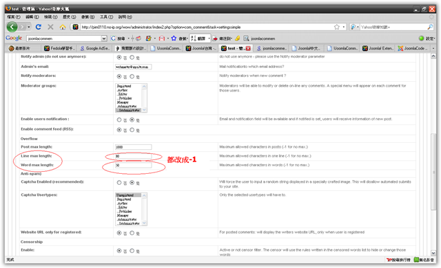 首先登入後台我這邊是英文語系,進到JoomlaCommen裡的Conent Settings(內容配置),然後切到Security(安全),這個選項,將Line max length(每行長度限制),和Word max length(每個單字長度限制) ,分別從預設的80,50通通改成-1代表不受限制,然後記的要應用儲存,這樣就OK了。